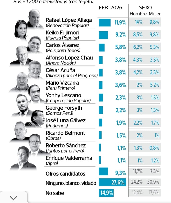 Datum: Rafael López Aliaga lidera preferencias con 11,9%