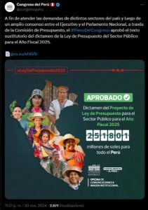 El proceso de aprobación del presupuesto fue complejo, ya que el debate se suspendió varias veces antes de la aprobación final el 30 de noviembre. A pesar de las complicaciones, el Congreso cumplió con el plazo establecido para enviar la ley al Ejecutivo. El presupuesto de 2025 busca atender las principales demandas sociales y mejorar la infraestructura, aunque sigue siendo objeto de críticas por su sostenibilidad fiscal y su efectividad para reducir las brechas en las regiones vulnerables.